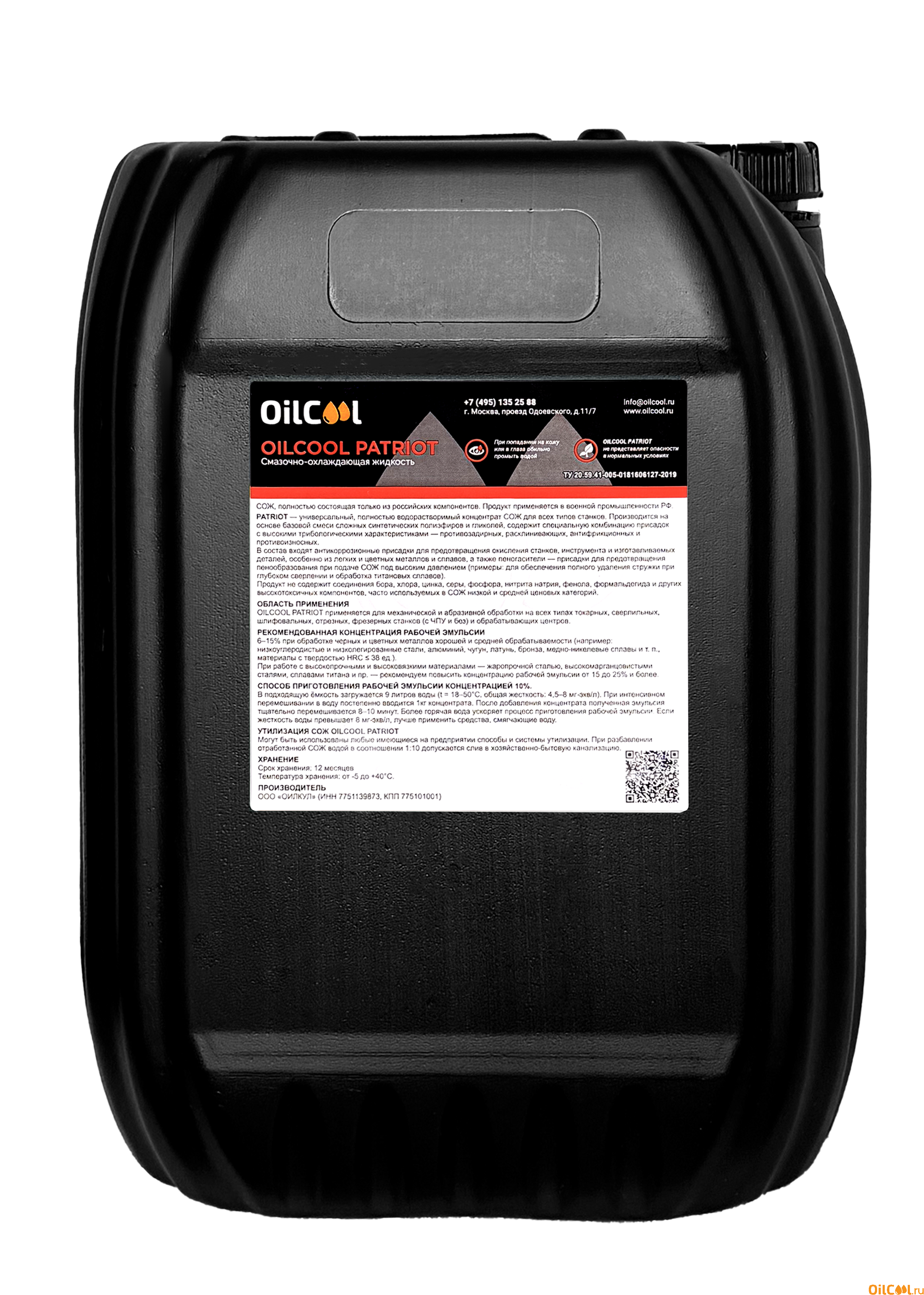 Смазочно-охлаждающая жидкость OILCOOL PATRIOT - молочного цвета, производится на основе смеси различных масел и содержит специальную комбинацию присадок с высокими трибологическими характеристиками - противозадирных, антифрикционных, противоизносных и антибактерицидных присадок (для сохранения биостабильности во время работы). В состав входят антикорозийные присадки, для предотвращения окисления станков и инструмента, а также изготавливаемых деталей. Пеногасители - присадки для предотвращения вспенивания при тяжелых операциях (пример: глубокое сверление при высоких оборотах).