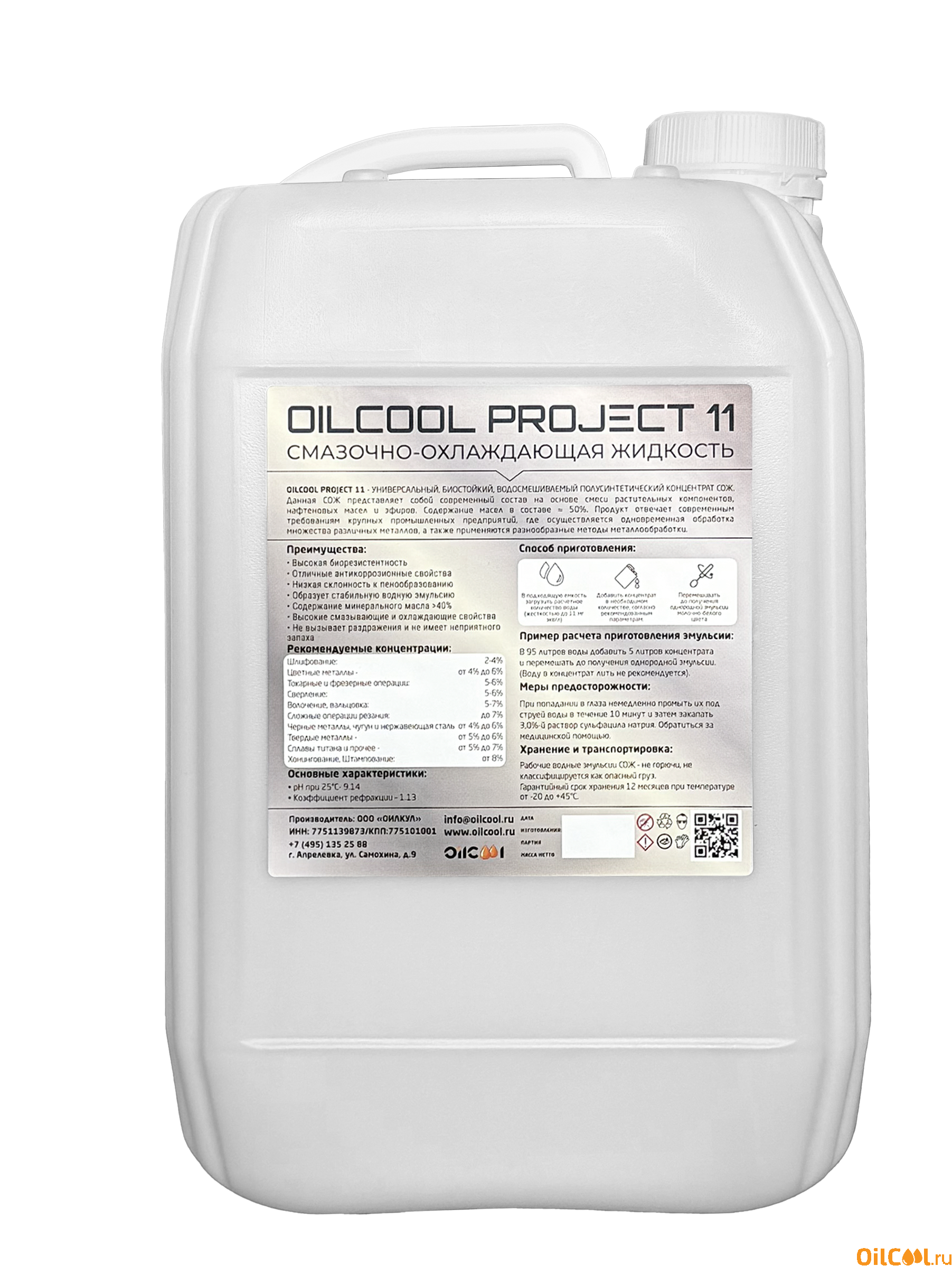 СОЖ OILCOOL Project 11 - продукт состоящий на 100% из высококачественных российских компонентов, независимый от импортных поставок. Он представляет собой современный состав на основе смеси растительных компонентов, нафтеновых масел и эфиров. Содержание масел в составе ≈ 50%. Продукт отвечает современным требованиям крупных промышленных предприятий, где осуществляется одновременная обработка множества различных металлов, а так же применяются разнообразные методы металлообработки.